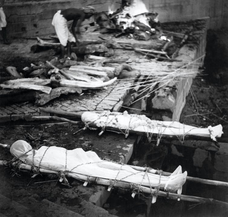 Instead, the virus tore through the subcontinent, following trade and postal routes. Catastrophe and death overwhelmed cities and rural villages alike. Indian newspapers reported that crematoria were receiving between 150 to 200 bodies per day. According to one observer, “The burning ghats and burial grounds were literally swamped with corpses; whilst an even greater number awaited removal.”