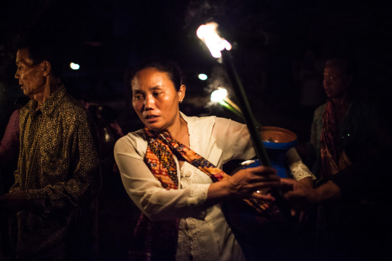 The event continues into the night as Sukinah leads a group of women farmers, followed by villagers who carry bamboo torches in their hands, heading to a sacred well. They sing the same song.